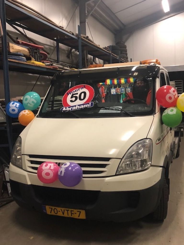 Werknemer Jaco Hoogendoorn is op 11 oktober 2018 50 jaar geworden. Dat hebben wij bij Verhuur- & Aannemingsbedrijf A.J. Hoogendoorn jr. natuurlijk niet zomaar voorbij laten gaan, toen hij 's ochtends bij zijn bus aankwam was hij mooi versierd en mocht hij daar de hele dag mee gaan rijden. We hopen dat hij nog een aantal jaren het team blijft versterken.